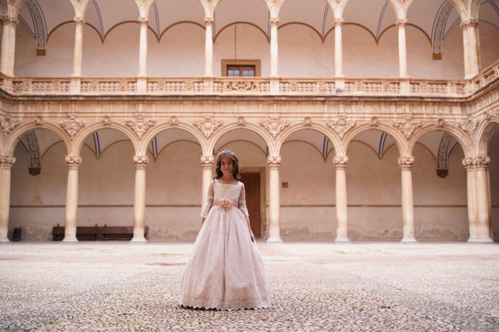 Sus columnas, arcos y la luz que entra por el patio interior crean un entorno perfecto para retratos elegantes y atemporales. En este escenario realizamos algunas de las fotografías más especiales del reportaje de Valentina.